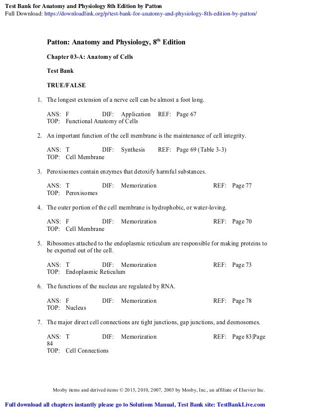 Test Bank for Structure and Function of the Body 15th Edition Patton. 1 Download Test Bank for Human Physiology An Integrated Approach 8th Edition Silverthorn Textbook of Anatomy and Page 834. Anatomy And Physiology Patton Thibodeau 8th Edition Test Bank Author.