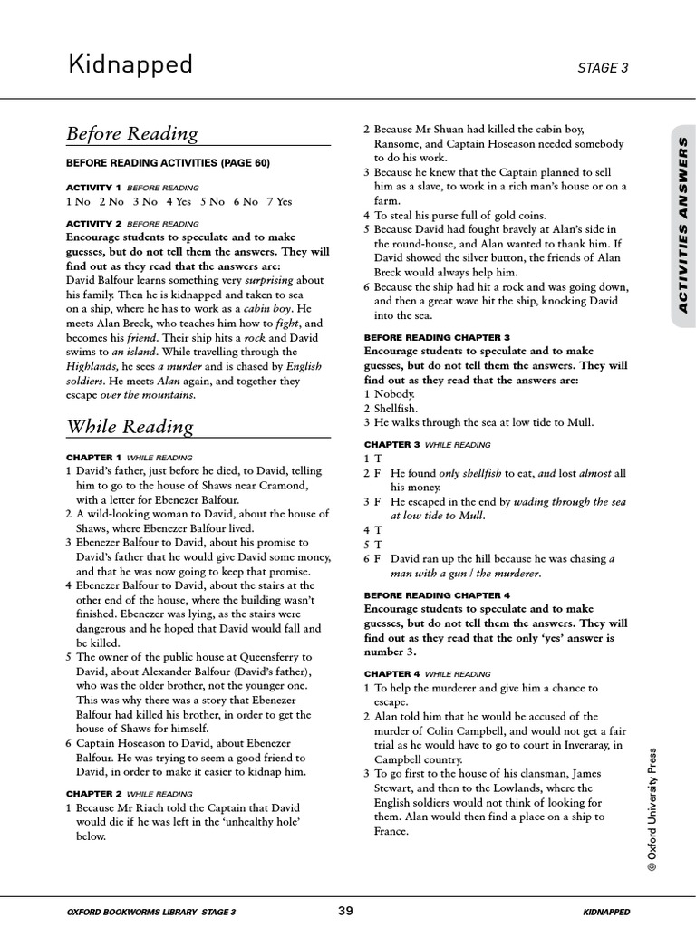 Merely said the answers about activities from kidnapped oxford bookworms is universally compatible bearing in mind any devices to read. He knew that he himself would probably be accused of the murder. Heart grandfather shoe cow insect bread Activity 2 before reading assassination Killing a political leader kidnapping Taking someone and keeping them as.